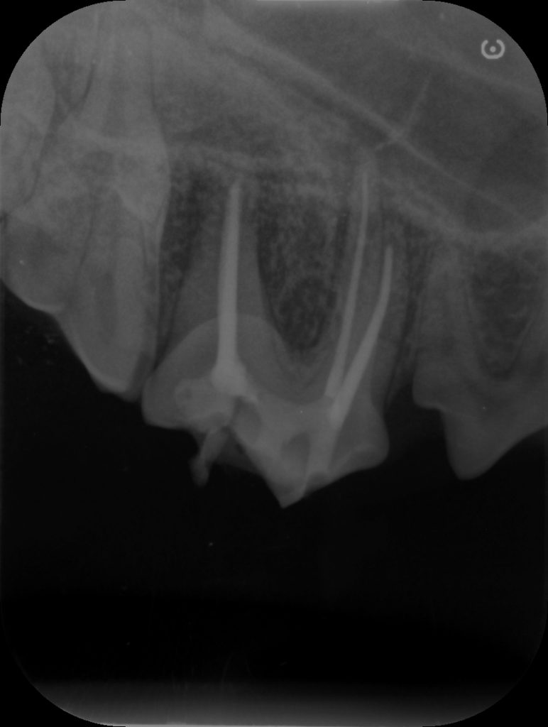 処置が終わるとこのように神経のあった管に白いものが詰まっている状態になっています。これにより汚いものが根っこの先から出ないようにできます。