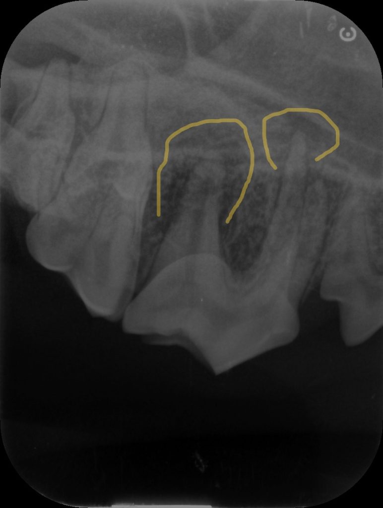 神経が死ぬと歯の根っこの先に腐ったものや細菌が侵入します。そうなると根っこの先の骨が炎症を起こして溶けていきます。場合によっては顔の目の下の皮膚から膿が出る場合があります。